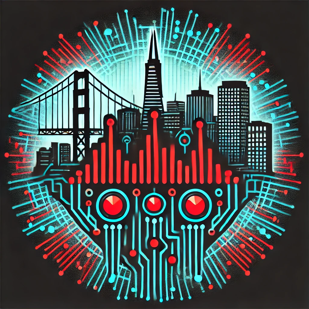 DALL·E 2024-07-27 19.50.09 Make a logo with black and red noisebridge circuit in front of a web of neon blue lines overlying San Francisco skyline with buildings peeking through.